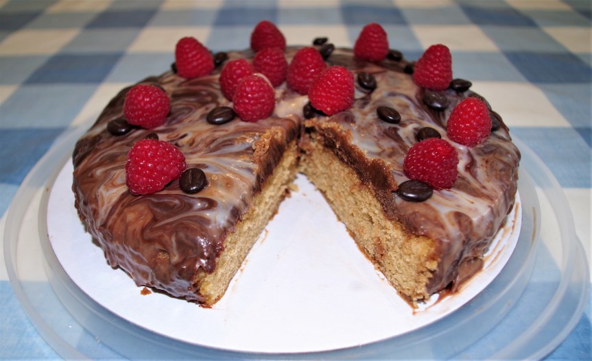 The sweet, rich and darkly beautiful marbled glaze compliments the coffee liqueur-laced sponge perfectly.