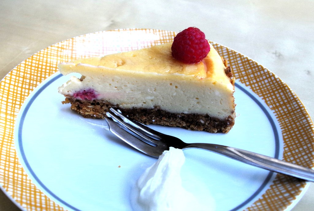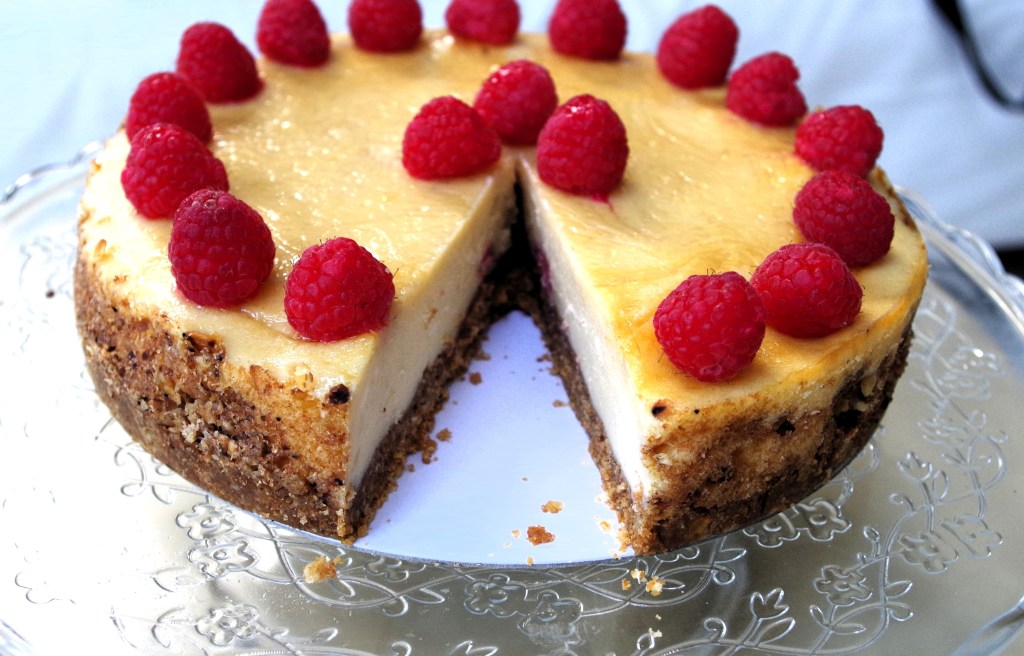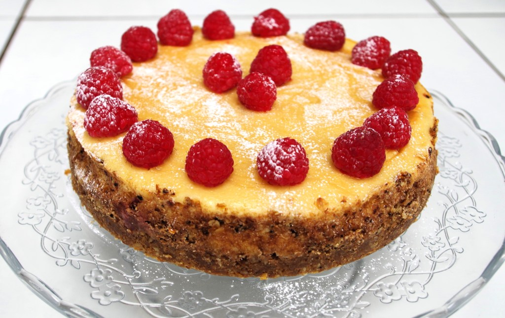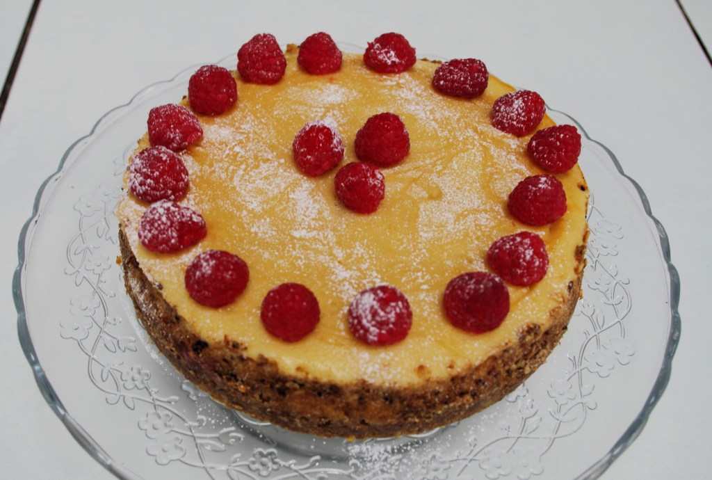 9. Take the cheesecake out of the fridge and decorate with the fresh raspberries. Dust with icing sugar before serving.