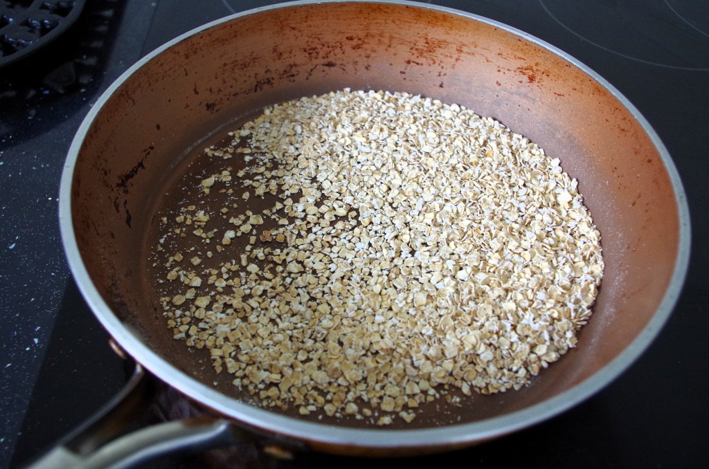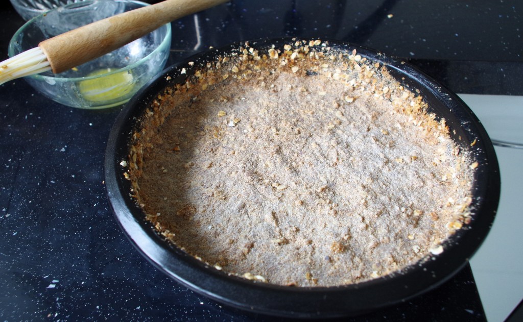 5. Lightly brush melted butter on the inner sides of the cake tin then sprinkle with toasted oats and/or oat meal until nicely coated. (This is optional, worth doing if you want crunchy sides to the cheesecake.)