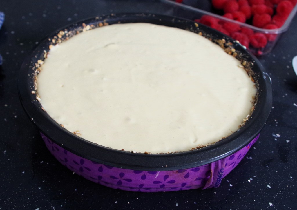 8. Tap the tin firmly on a work surface to release any air bubbles then bake for around 40 – 42 minutes. (It needs to be almost set, with a slight wobble in the middle.) Turn the oven off and leave the cheesecake in for at least an hour to cool, with the door ajar. Place the cheesecake in the fridge for 1 – 2 hours.
