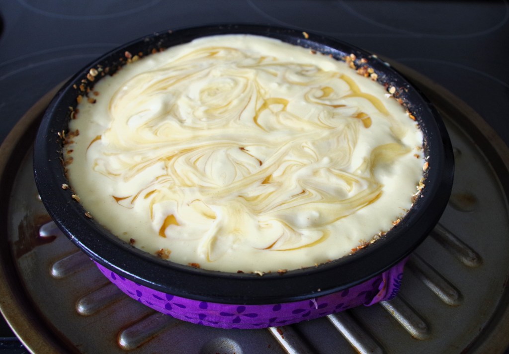 7. Gently, pour in the cheesecake mixture. Then swirl in the honey. (Don’t blend it in.)