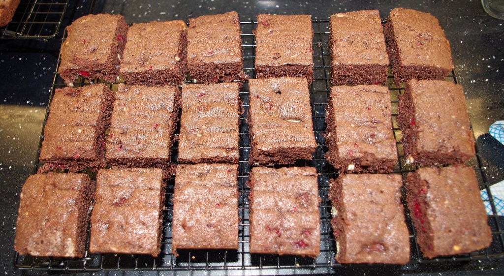 7. Allow to cool in the tin for 5 – 10 minutes. Either remove and cut into pieces or cut while still in the tin. (I use cocktail sticks to mark the slabs for cutting)