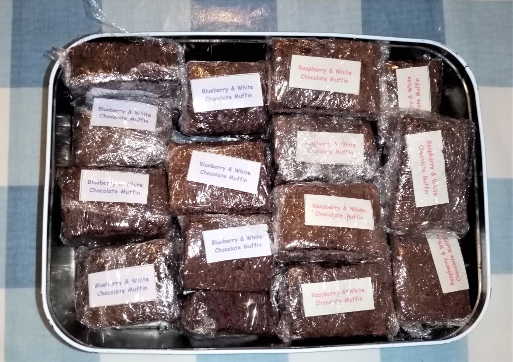 I recently made two batches, one raspberry, one blueberry, for our church meeting. We’re currently only allowed to have fifty people on site so it was just enough. But I had to wrap each piece individually to conform with Covid 19 safety guidelines. They all “went” so it was worth it.