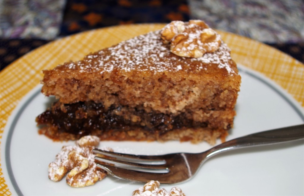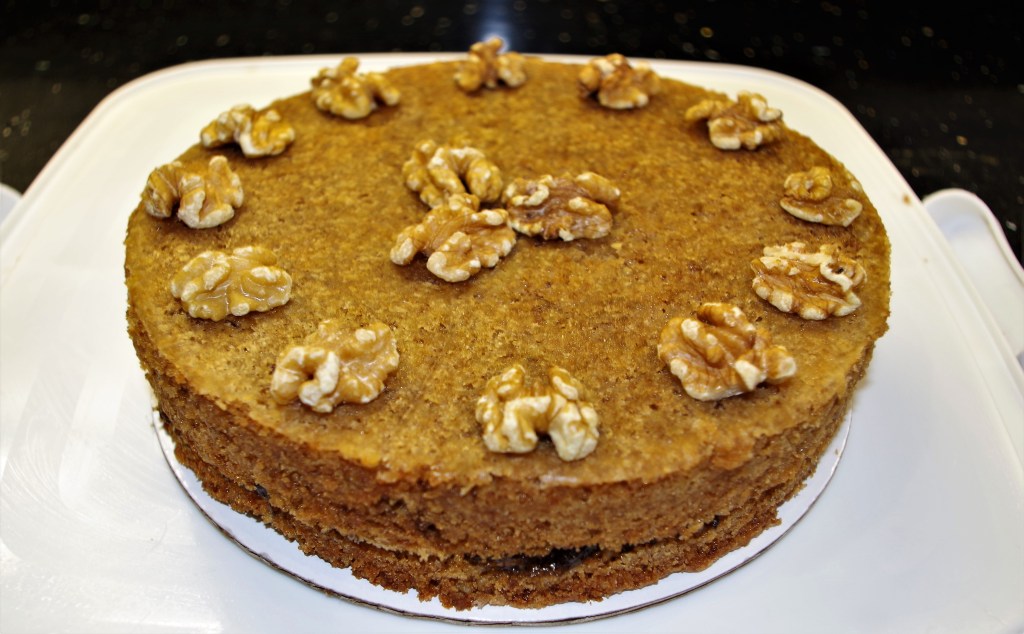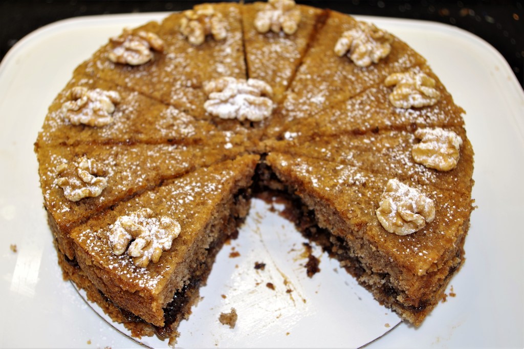 8. Cut the cooled cake horizontally into two halves. Combine the two halves using the date mixture. Add 12 walnut halves around the top of the cake with 3 in the middle then sprinkle lightly with icing sugar before serving.