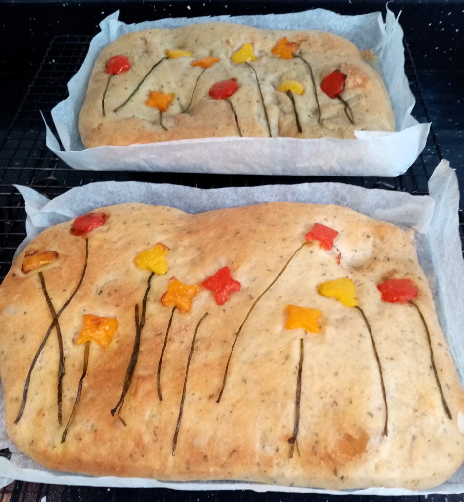 In the loaf shown here I used chives for the flower stems. This didn’t work very well as they were so thin they became quite crispy. Maybe spring onions sliced lengthways would have been better. For the flower heads I used red, yellow and orange bell peppers and dabbed the inner sides with kitchen paper to soak up the moisture. I had a set of small cutters in various shapes. I think this aspect was quite successful.