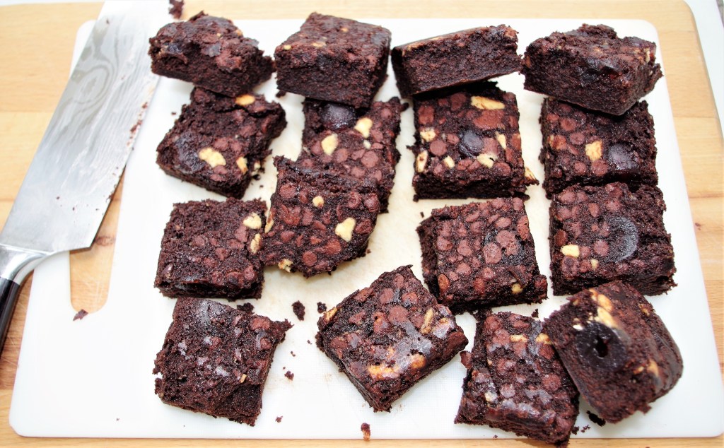 Needs: 20cm (8”) square tin or you could use a 20cm x 30cm for a thinner brownie. To follow the instructions you need a food processor, but you could adapt the recipe if you don’t have one.