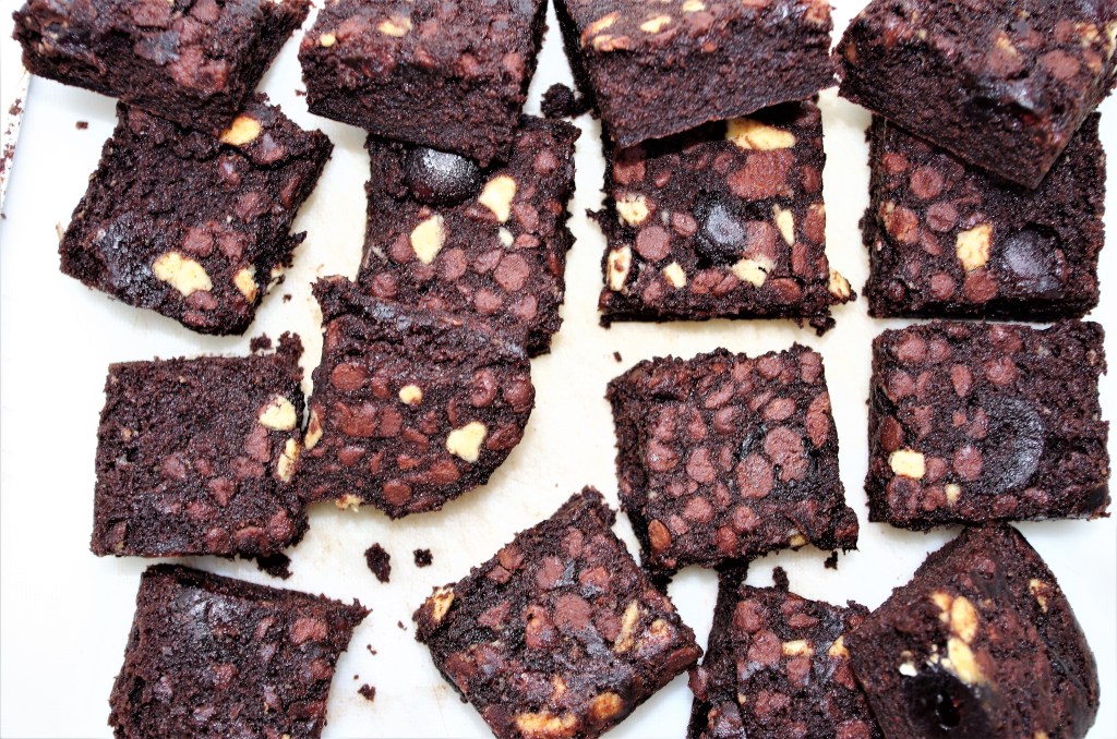 1. Oven on to 180C/ Fan 160C /375F/Gas 4. Line a 20cm (8”) square tin and line with baking parchment. (This gives 16 nice thick brownies. You could use a 20 x 30 tin for thinner ones, but reduce the baking time by around 5 – 10 minutes.) NB I no longer grease or butter my brownie tins, I simply wet the tin with water. Provided, I’ve cut the parchment big enough to leave no spaces it’s fine – it stays in place and leaves no greasy washing up.)