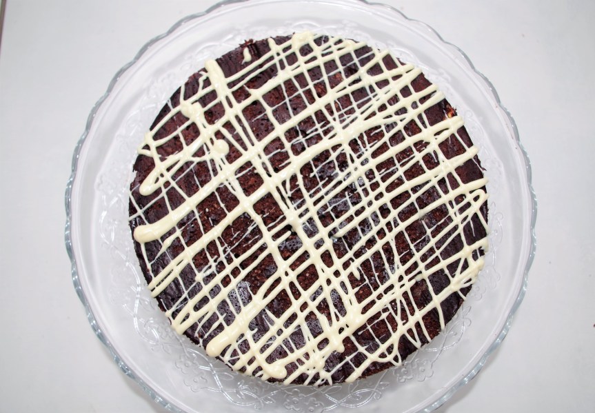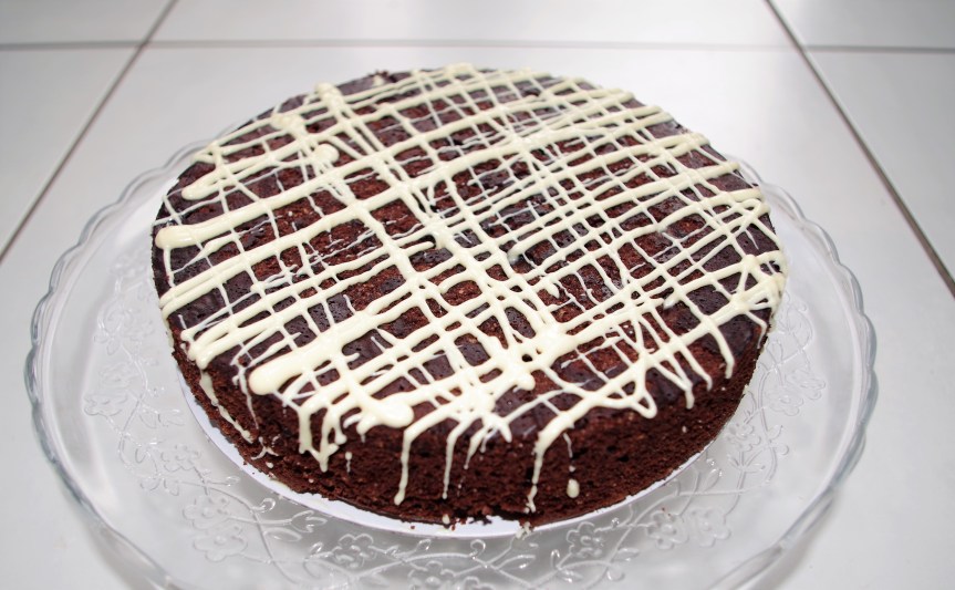 7. To decorate, either sprinkle with icing sugar just before serving or melt the white chocolate. (Either in the microwave using short blasts and stirring regularly, or over a bain marie. Whichever method used, be gentle and patient as white chocolate burns easily.)