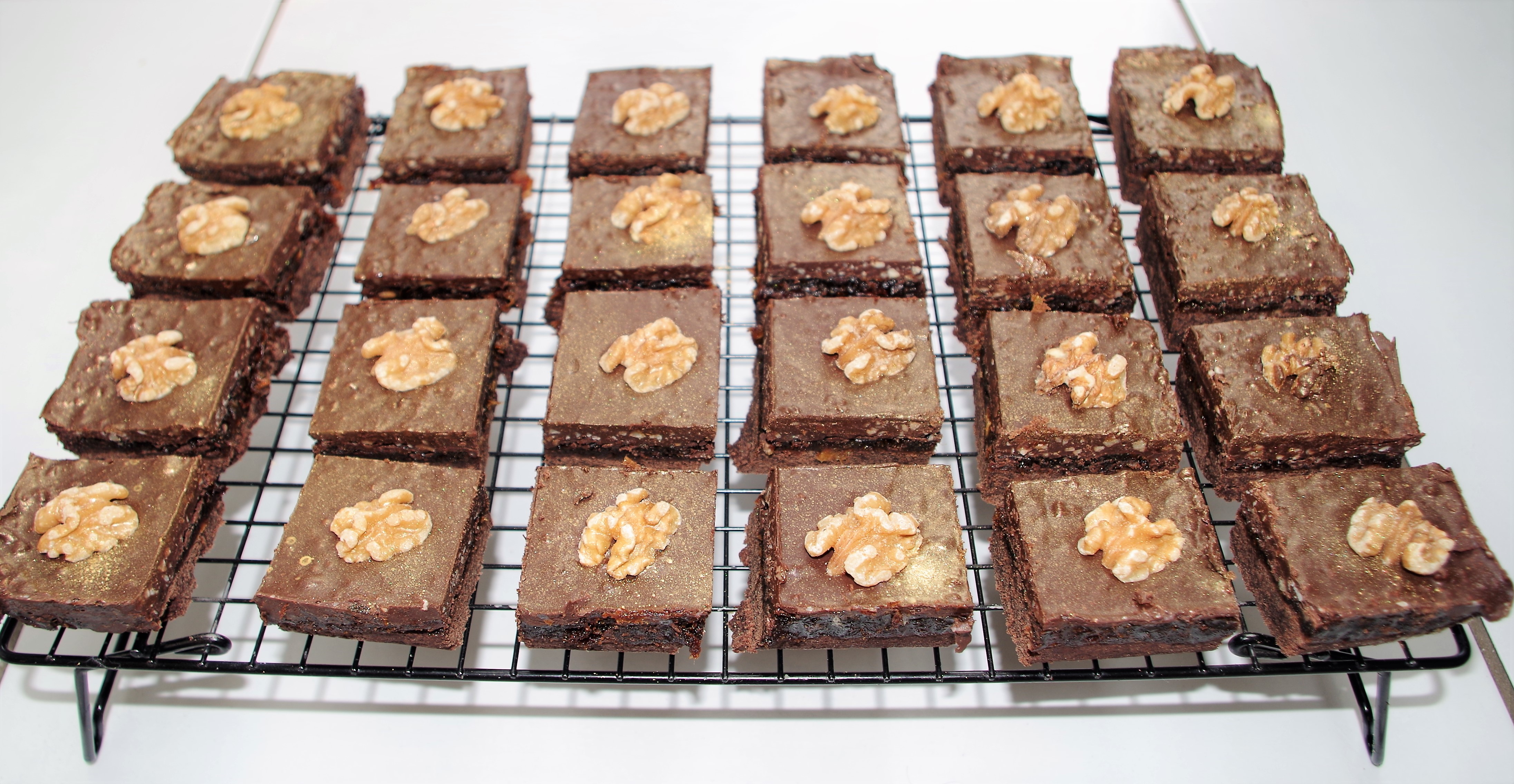 12. When the chocolate begins to harden, mark the top into the desired number of pieces, probably 20 – 24. Place a walnut half onto each piece. When the chocolate has fully hardened, use a heated sharp knife (or a metal dough scraper or a pizza wheel) to cut through fully and neatly, then remove from the tin.