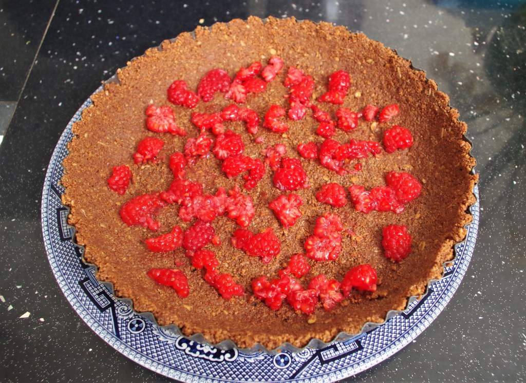 3. Cut your non-reserved raspberries into small pieces and spread them evenly over the chilled base.