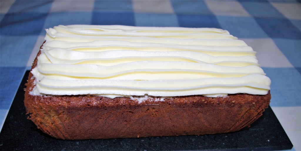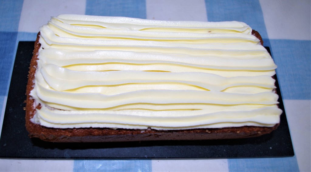 8. For this topping I used the following mixture: 75g full fat cream cheese + 75g softened butter. Beat together then sift in 200g icing sugar + 1/2 tsp almond extract. Beat again and pipe or spoon it on. “Other buttercreams are available”.