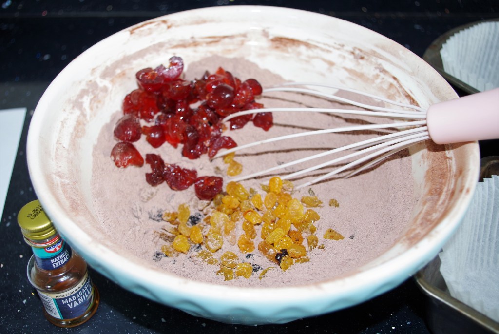 2. Sift the flour, cocoa powder, bicarbonate of soda and salt into a large bowl and whisk together. Toss the raisins and cherries in the flour until coated.