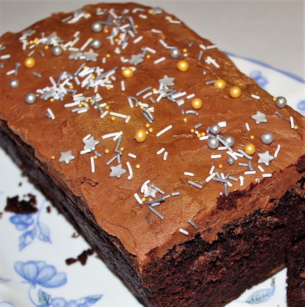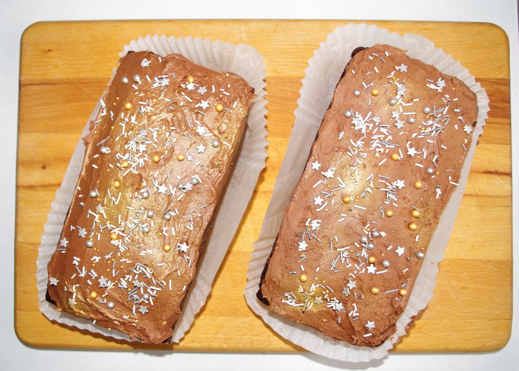 5. Either spread on with a spoon and palette knife or pipe on, then add sprinkles and gold spray if desired. (I played around making patterns with a fork, but wasn’t impressed by that, so stuck with a plain surface + sprinkles etcetera.)