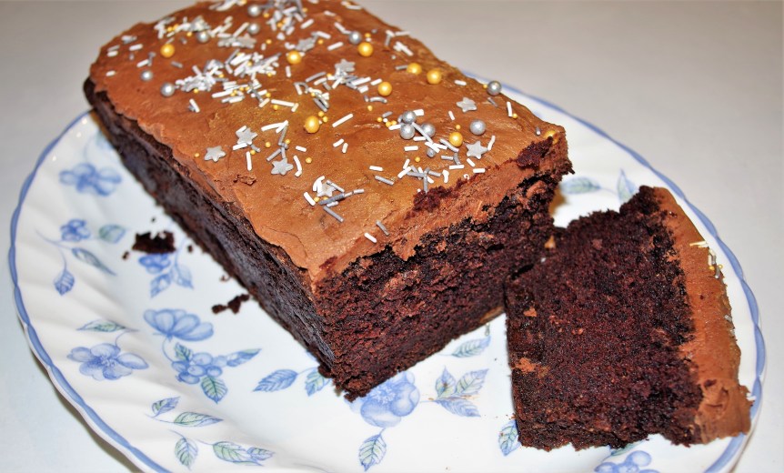I made two of these loaves together, simply doubling the ingredients. It all went well, except that when I realised the mixture was too much for the two loaf tin liners, I had to quickly line the tins more traditionally, with baking parchment to give a bit more space, then tip the two mixtures into the tins. This was a very messy (but tasty) job. The other problem – no, not a problem, more of a sacrifice – was to raid my wine cellar (the garage) and use nearly a whole bottle of reasonable plonk. I did test eat a slice from one of the cakes and it was good, so it was worth it and I still had a glassful left.