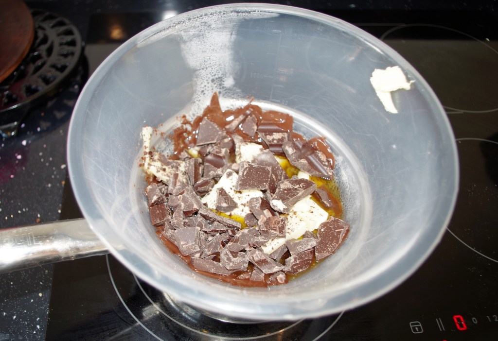 3. Melt the chocolate and butter in a large heatproof bowl set over a pan of simmering water. When the chocolate and butter have melted, remove from the heat and set aside.