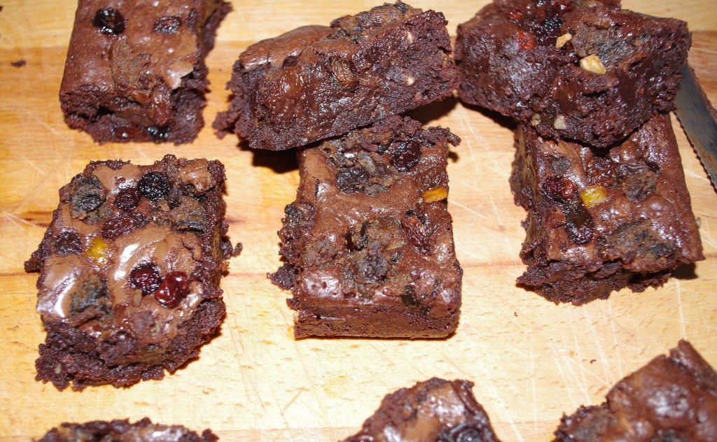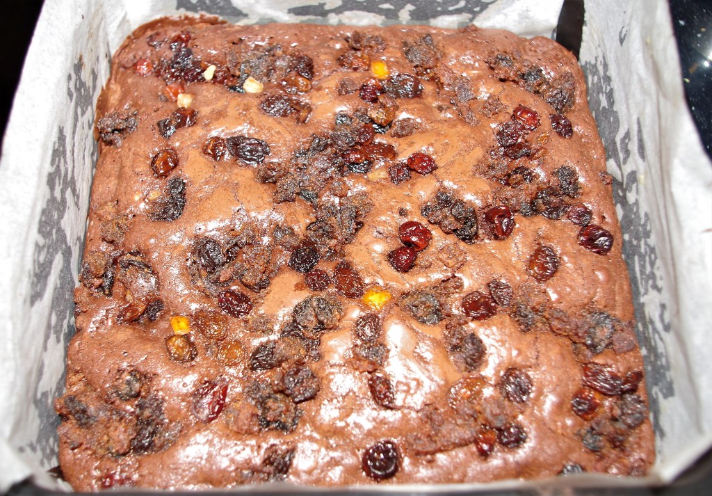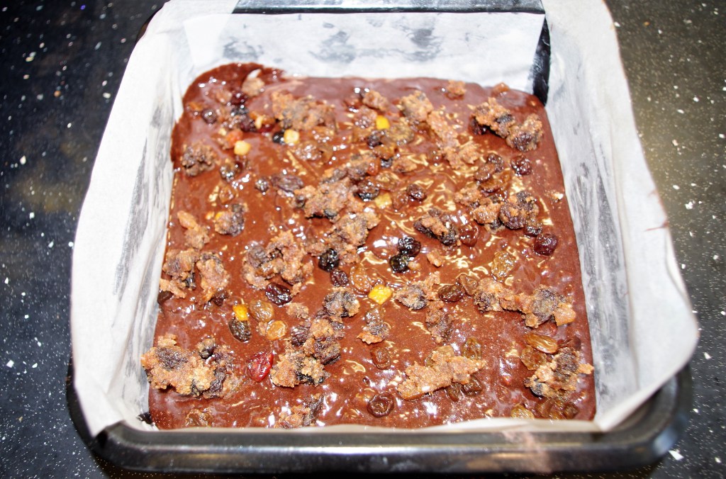 4. Whisk the eggs, sugar and salt in another bowl, then beat into the chocolate mixture. Sift and fold in the cocoa and flour. Spoon in most* of the Christmas pudding and most* of the macerated fruit. Fold in until just combined. (*Reserve enough to scatter over the top before baking.)