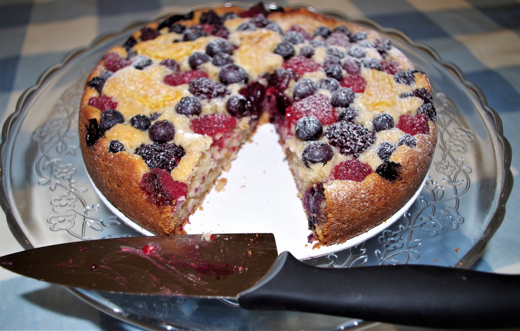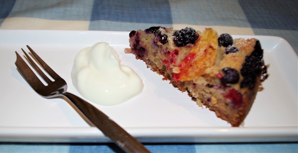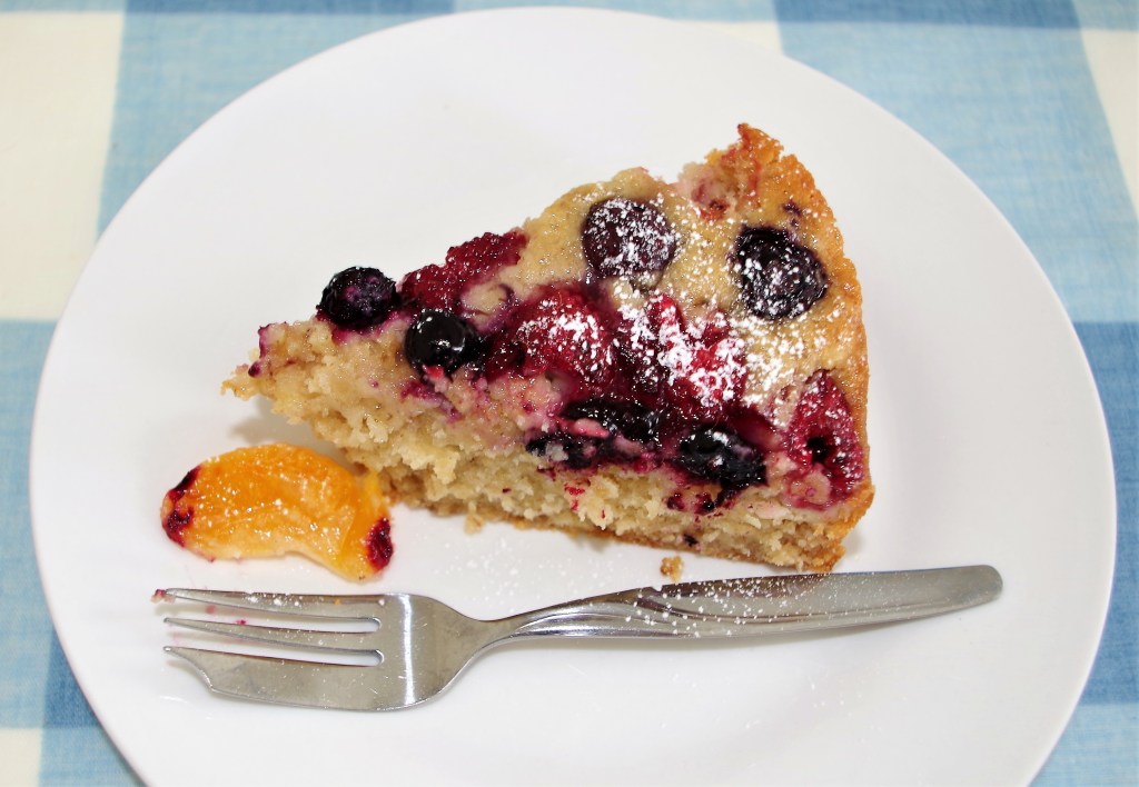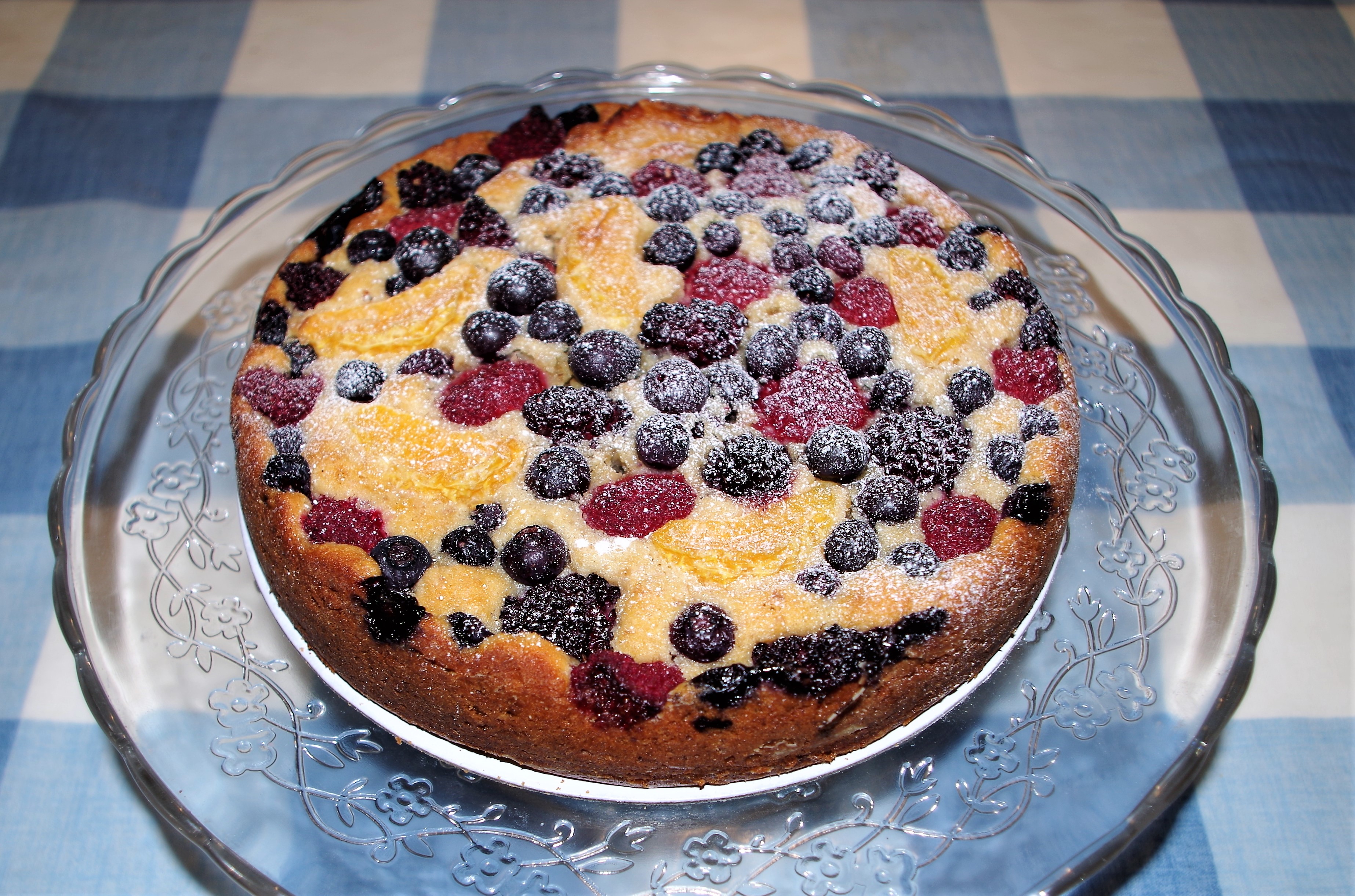 This colourful cake can make an honest claim to be “healthy” containing, as it does, lots of oats and honey – all topped by a medley of fruits.