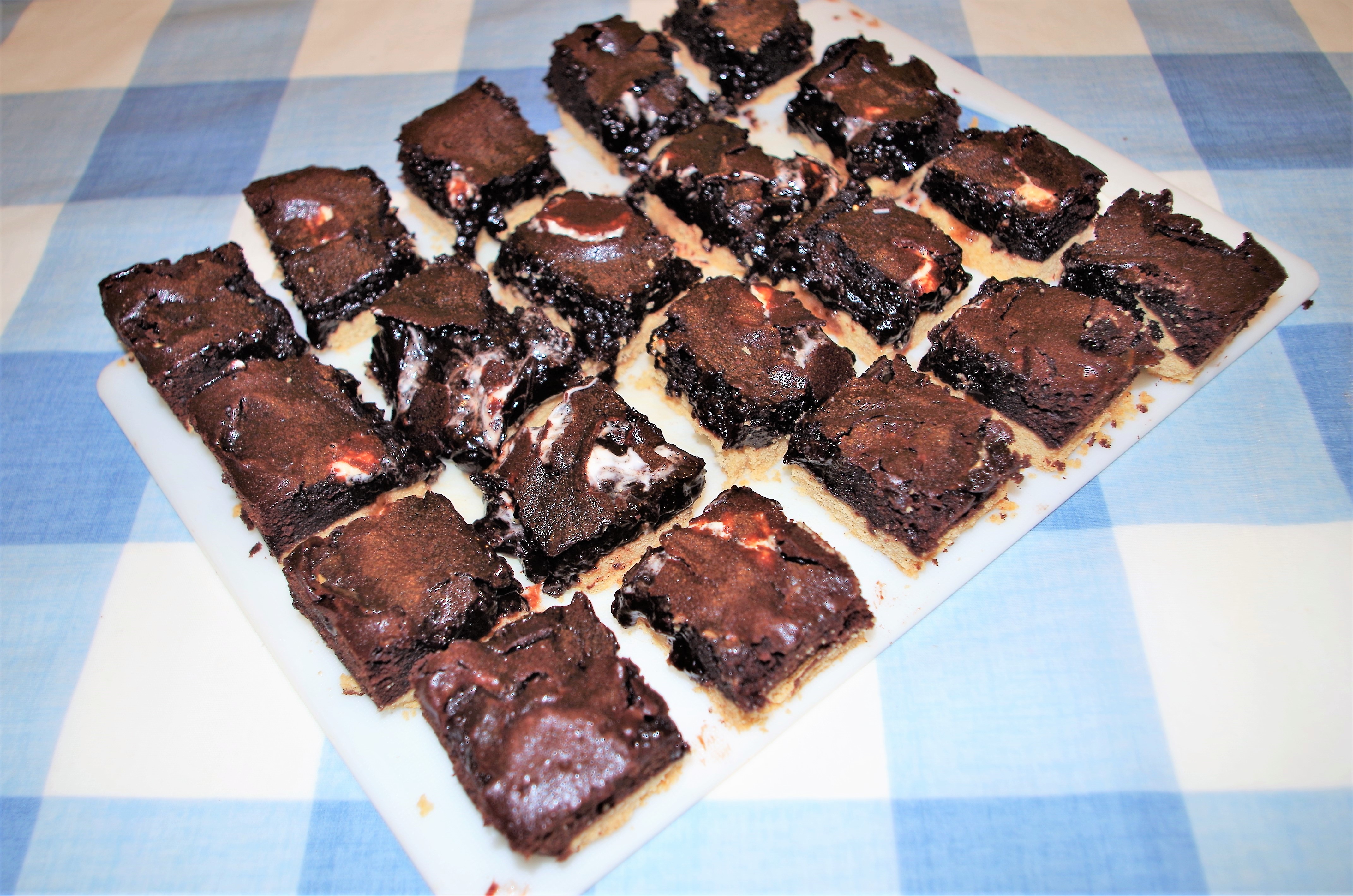 These are wonderfully rich, gooey brownies on a shortbread base so you can just about pick them up, but you might need a spoon. They may not be the neatest, most elegant looking brownies, but they’re definitely a contender for the “yummiest brownie ever” title.