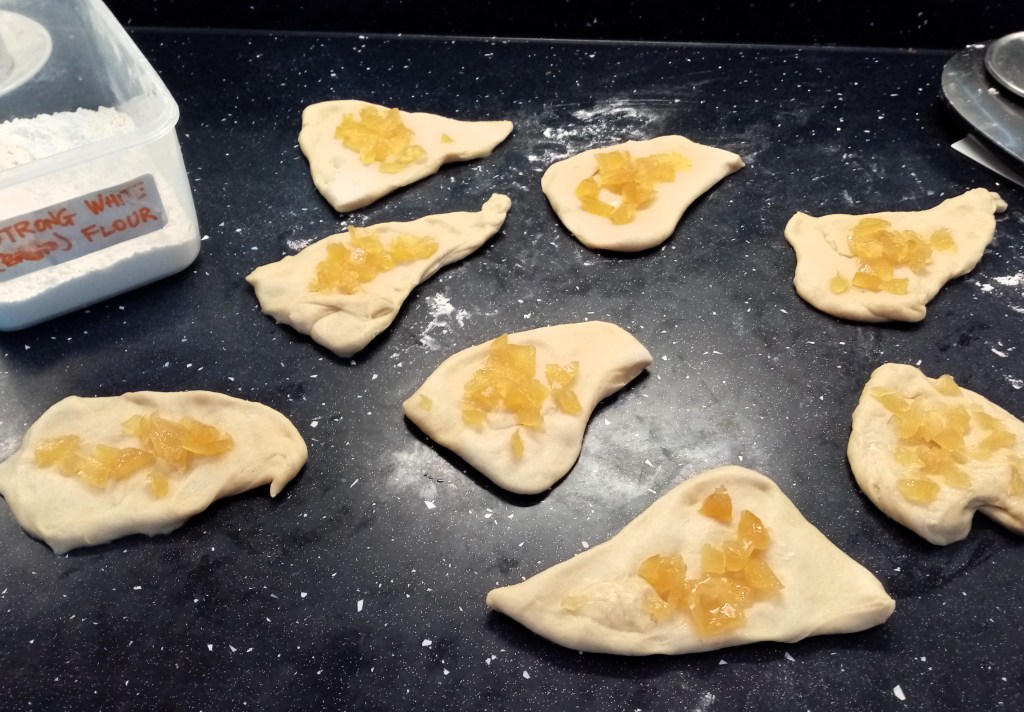 6. Knead the dough lightly then divide into portions*. Flatten each out on a lightly floured work surface and add equal amounts of chopped stem ginger to each one. Shape them into balls and use cupped hands to enclose each ball and drag the outer surface taught. Push any protruding fruit into the dough to avoid them burning during baking. (* For eight pieces roll the dough into a circle, cut a cross to make four pieces then divide each into two = eight roughly equal pieces. For more precision use your scales.)