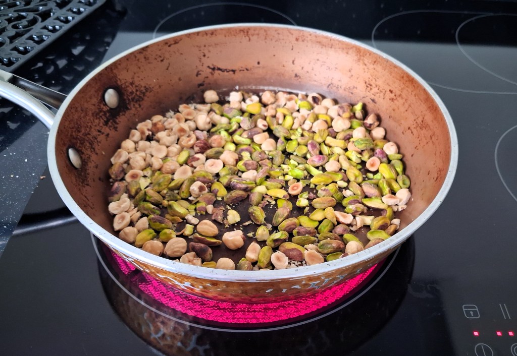 ** Roasting the nuts is not essential but it does increase the flavour. I prefer using a frying pan so I can keep a close eye on them as nuts easily burn.