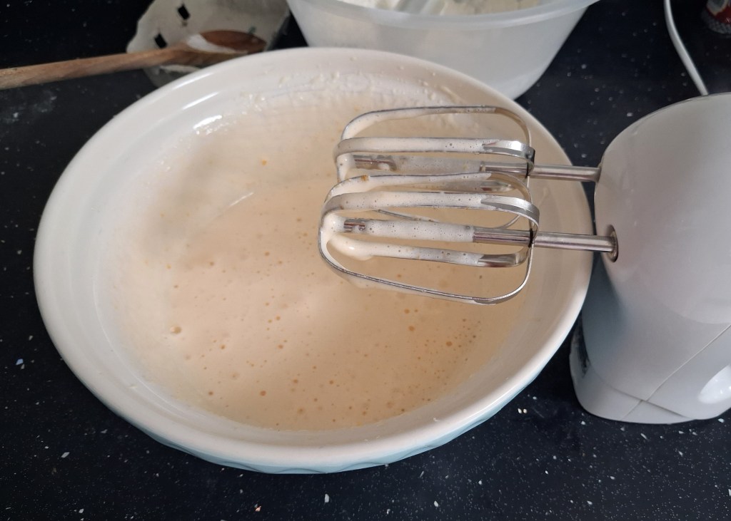 4. Whisk the eggs and sugar together in another large bowl until light and creamy. Stir in the cream or milk then fold in the flour mixture. Add in the cooled nuts, chopped cherries and chocolate chips, then mix to a firm dough.