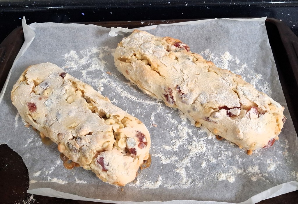 5. Divide into two pieces and roll each one into an oblong shape. Place on the lined baking tray, well apart. Bake for 18 – 20 minutes.