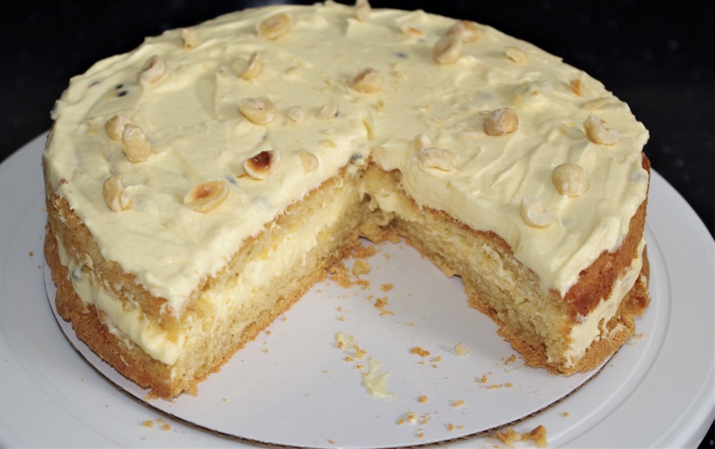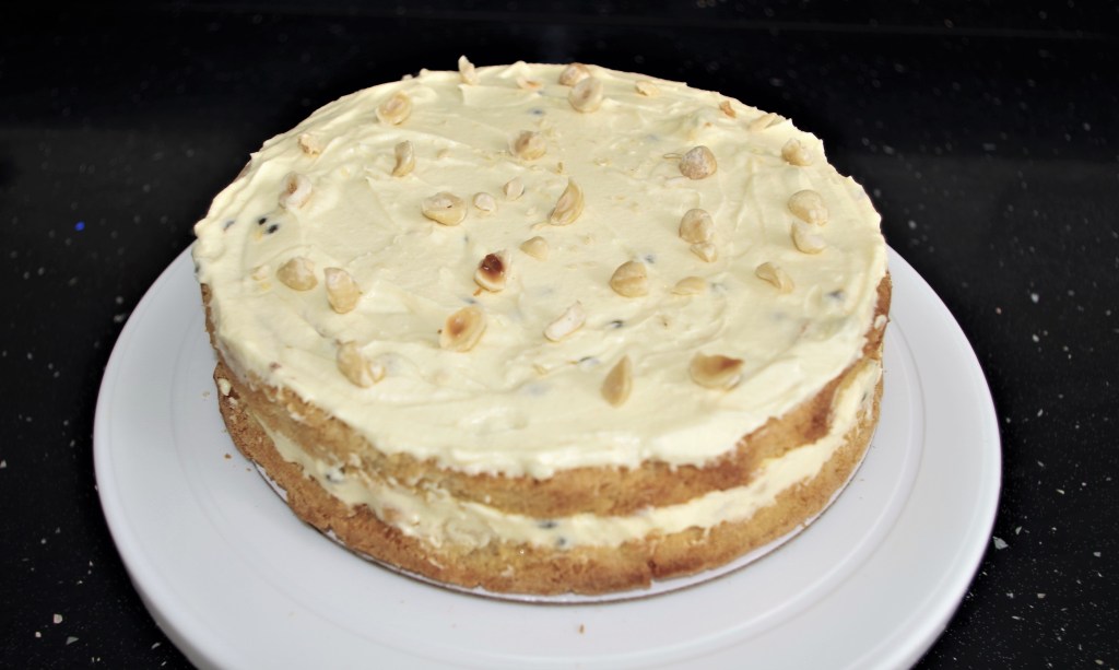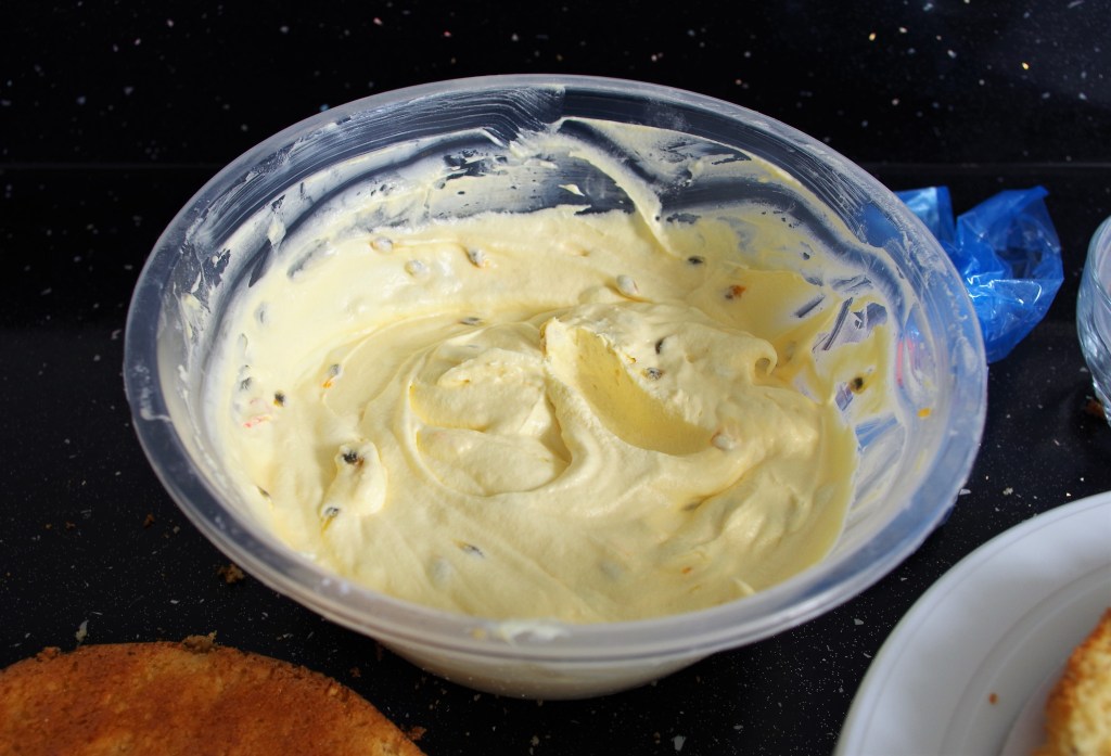 7. Stir in the melted white chocolate and the double cream then whisk for a few minutes. Stir in the passion fruit. Set aside about a third of the mixture to use as a topping (or put a dollop on each top cake now.) Stir two thirds of the chopped nuts into the remaining mixture.