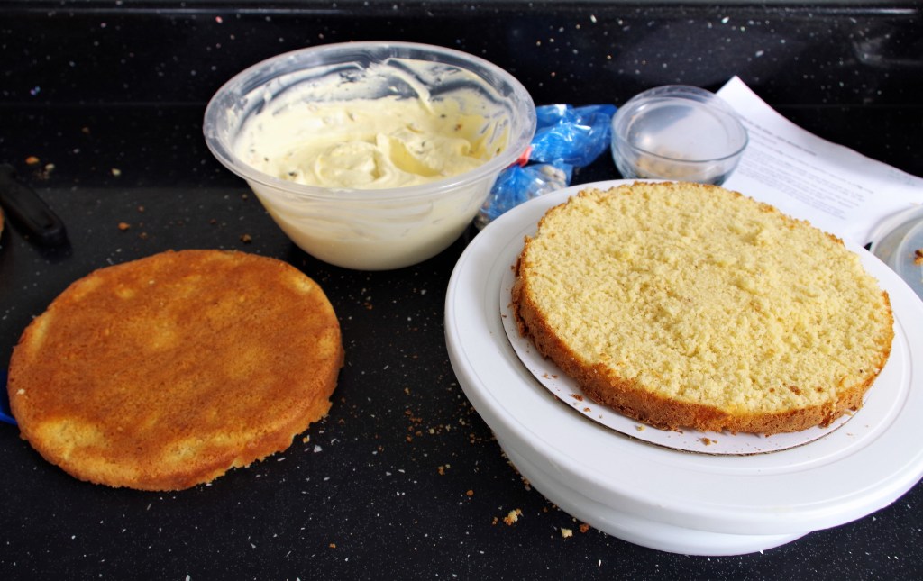 4. Bake the sponges for 30 – 36 minutes, until shrinking away from the sides of the tins. Remove from the oven and leave in the tins to cool for 10 minutes then turn out onto a wire rack to cool fully. Once cool, slice each cake in half horizontally.