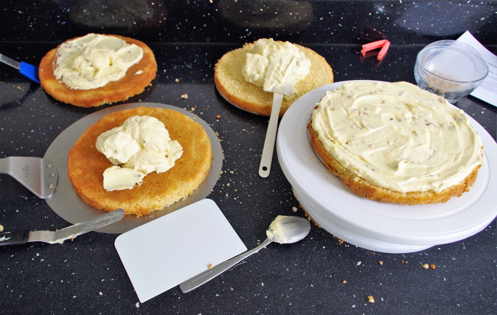 8. Place the lower half of one cake on a turntable and use half of the filling to attach the top half. Repeat with the other cake. If you haven’t already done so, cover the tops of each cake with the remaining mixture and sprinkle over the remaining chopped nuts. Put the cakes in the fridge for at least 30 minutes