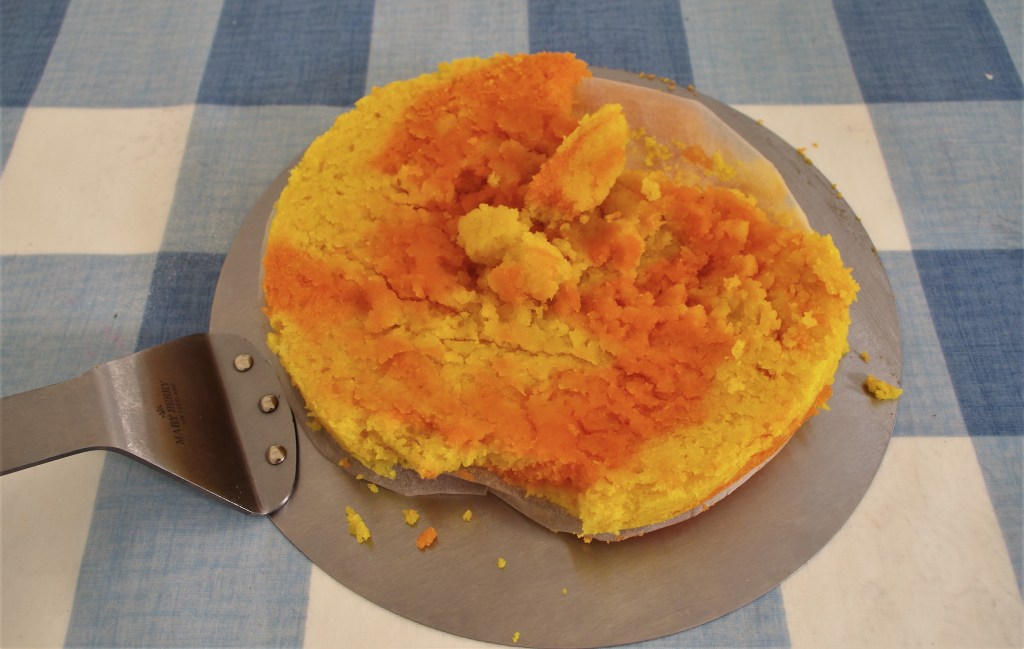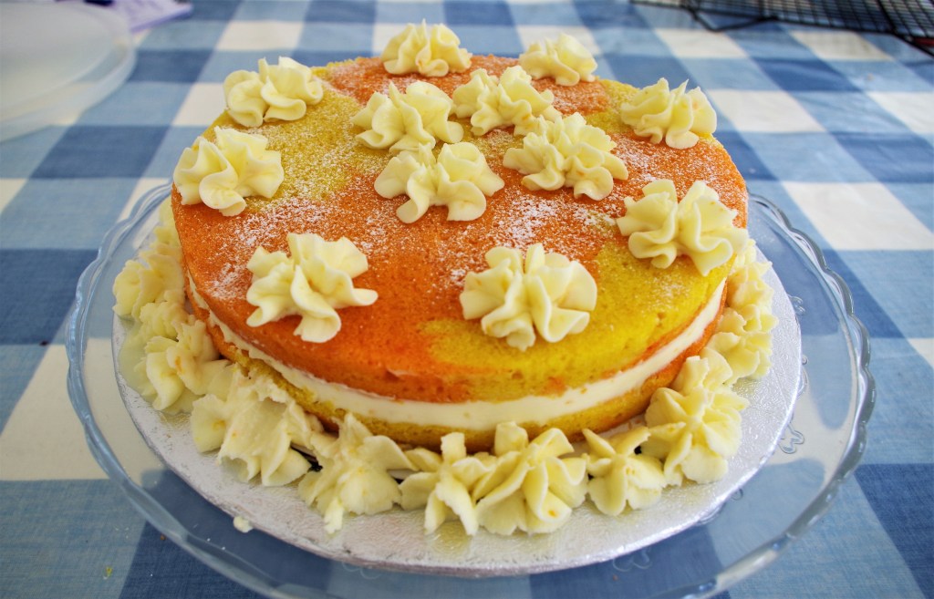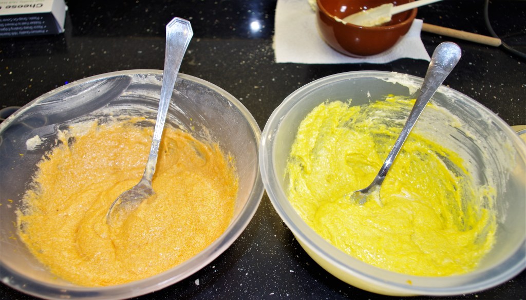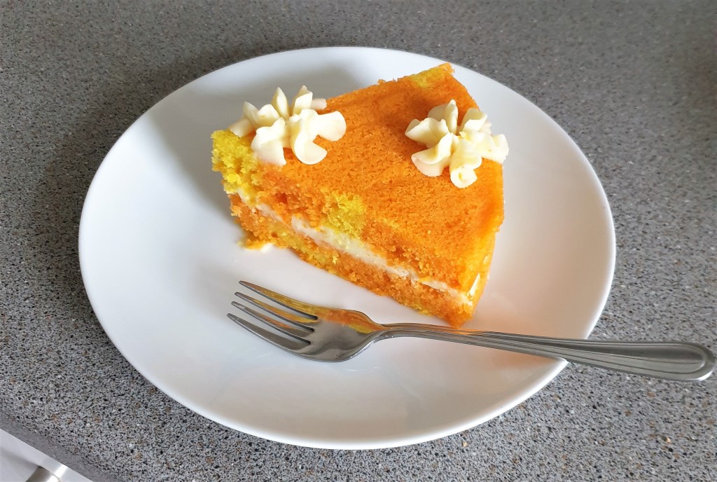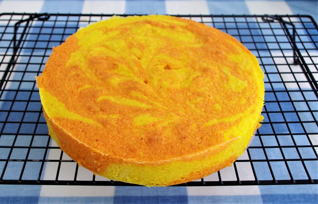 This super citrus cake is based on my previous St-Clements-cake, which is also very tasty. Here I’ve gone for a richer version with two layers. I also decided it would look good if I halved the mixture, coloured and flavoured each half either lemon or orange then marbled the cake. It worked even better than I’d hoped.