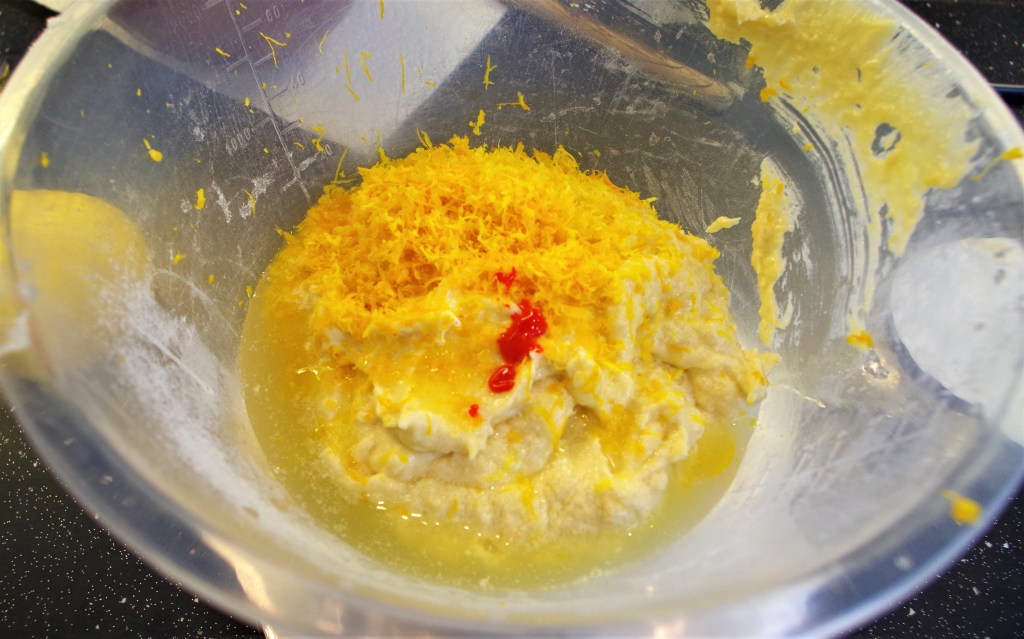5. Divide the mixture equally into two bowls. Into one bowl add the zest of a lemon, a few drops of lemon extract (if using), 20ml/0.25fl oz lemon juice and a little yellow food colouring. Into the other bowl add the zest of an orange, a few drops of orange extract (if using), 20ml/0.25fl oz orange juice and a little orange food colouring.