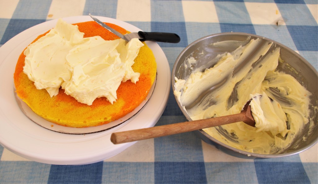 8. For the topping, beat the mascarpone then sieve in the icing sugar and stir in just enough juice to achieve a thick but spreadable consistency. Grate in the zest and stir. Place in fridge for half an hour to “firm it up” if necessary.