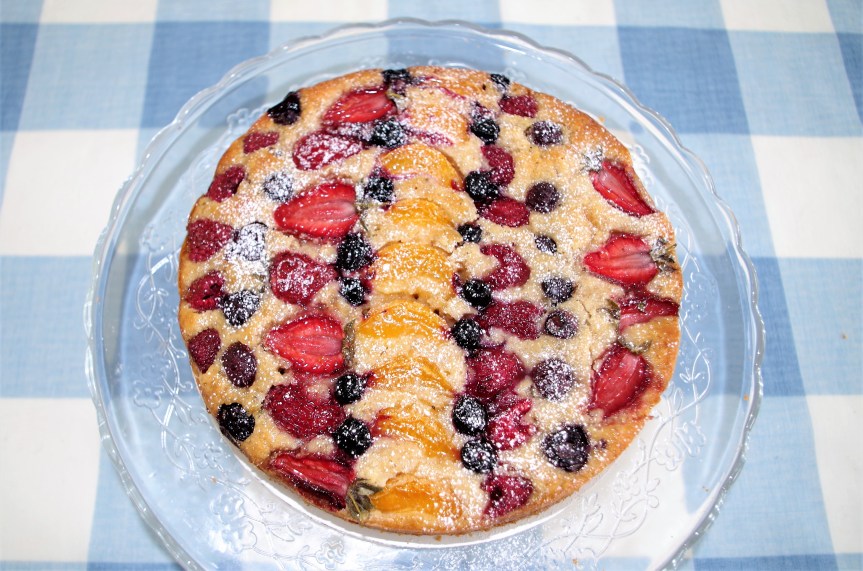 5. Bake for around 50 – 55 minutes, but check at 45, especially if you sprinkled Demerara on top, just in case it’s getting a bit dark. Test with a skewer and if it comes out clean and dry, the cake has baked.