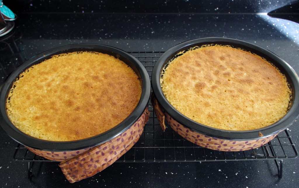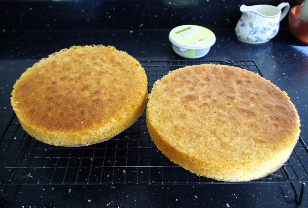 4. Divide the mixture equally between the two tins. Bake for about 25 minutes. Leave in the tins for 5 minutes then turn out onto a wire rack to cool fully.
