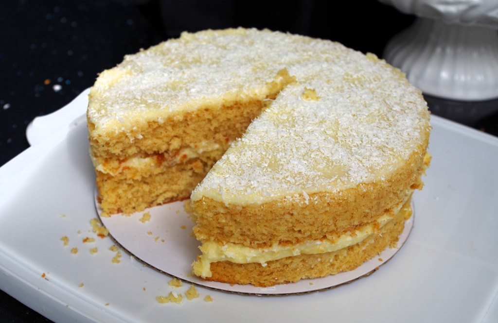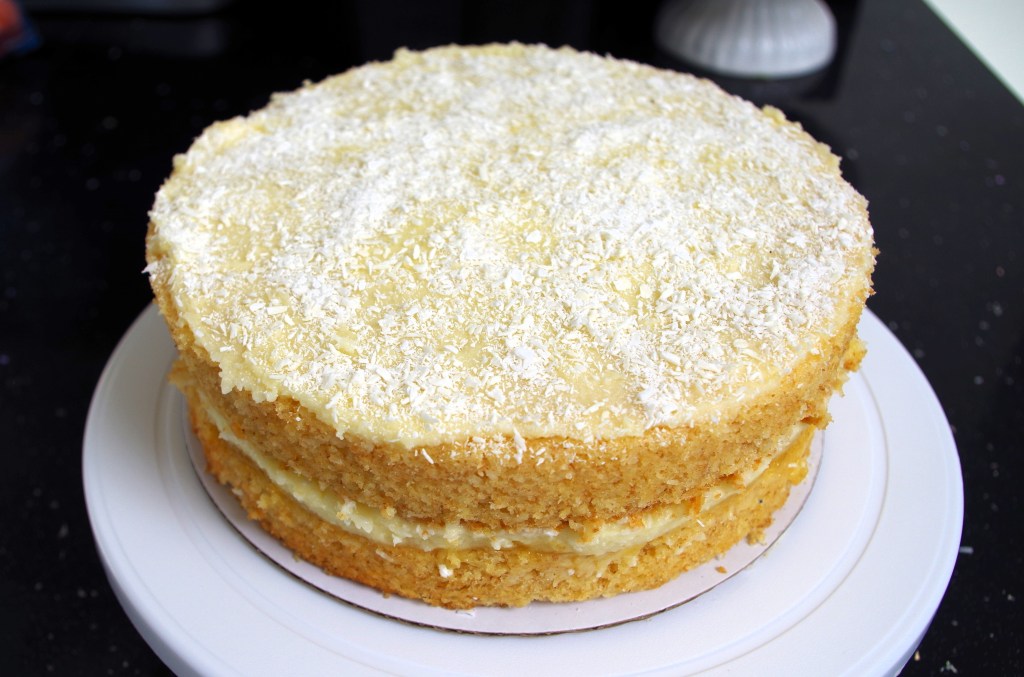 6. Spread a layer of lemon curd on one of the cakes, followed by about 2/3 of the filling cream with some desiccated coconut mixed in. Put the other cake on top and cover with the remaining 1/3 of the cream. Sprinkle over some desiccated coconut. (I actually put the topping on first, then added the coconut into the remaining mixture – just a slight difference, because I planned to add coconut to the topping and didn’t want to overdo the coconut.)