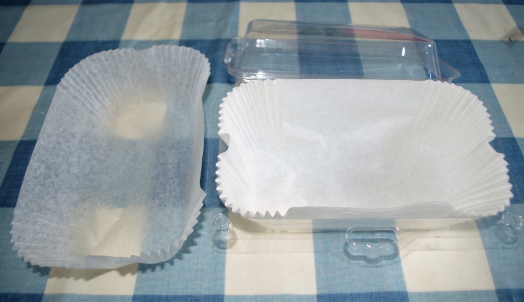 - Use a 900g/2 lb loaf tin. Either grease it and line with baking paper or pop in one of the pre-shaped loaf tin liners. (*I recommend the latter; they’re so easy and there’s no need to grease the tin. Also, if you want to give the cake away or transport it, it’s half wrapped already. Picture below. O.K. back to the plot….)