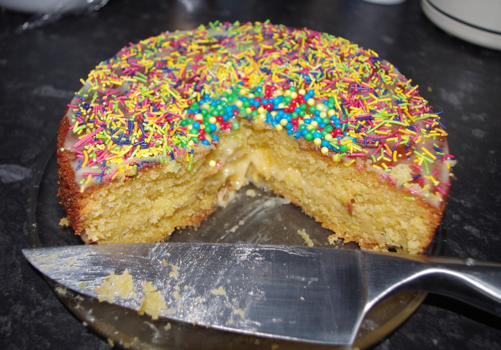 - Spoon or pipe the filling over the lower half* and carefully put the second half on top, flat side upwards. (*You need to save some if you intend having a thin layer on top of the cake to sit sprinkles on.)