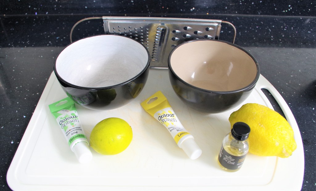 5. Divide the mixture between two bowls then add the finely grated zest and juice from each fruit separately. Stir in the food colourings and extract (if using) then whisk each bowl again for a few minutes – until thick, but still pourable.