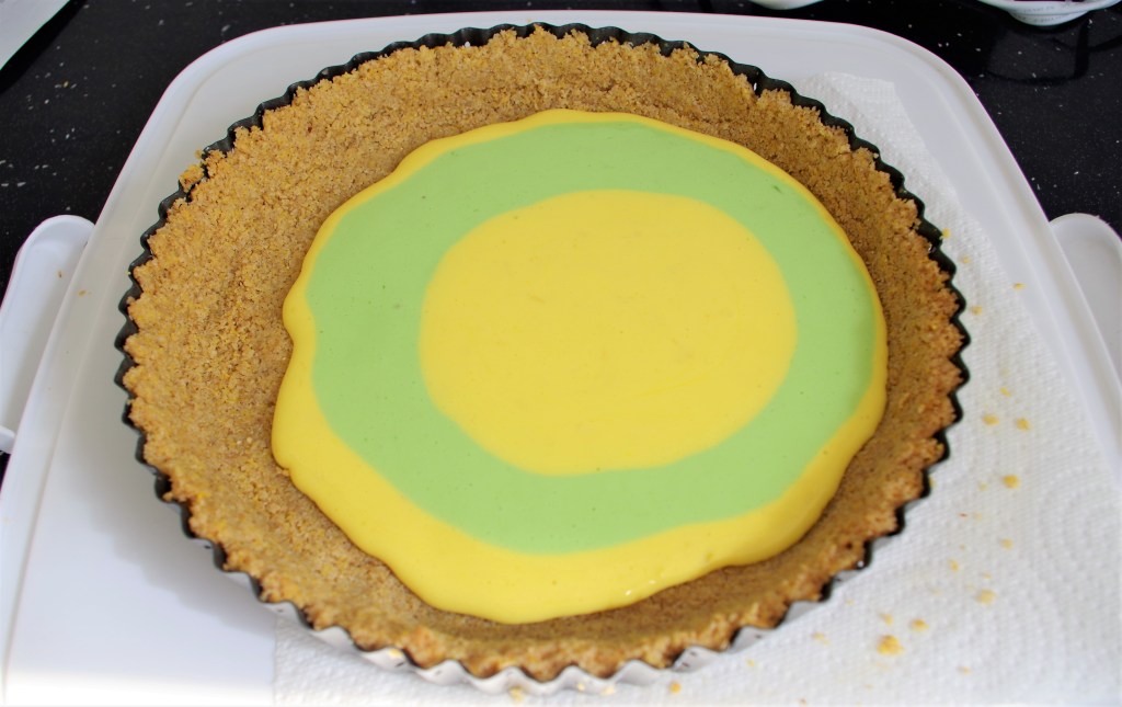 6. Put a dollop of one colour into the middle of the cooled base then add a dollop of the other colour on top and in the middle. Repeat this until both mixtures have been used. Next, gently drag a cocktail stick or similar item from the middle outwards to create a feathered effect. (see gallery 2 below)