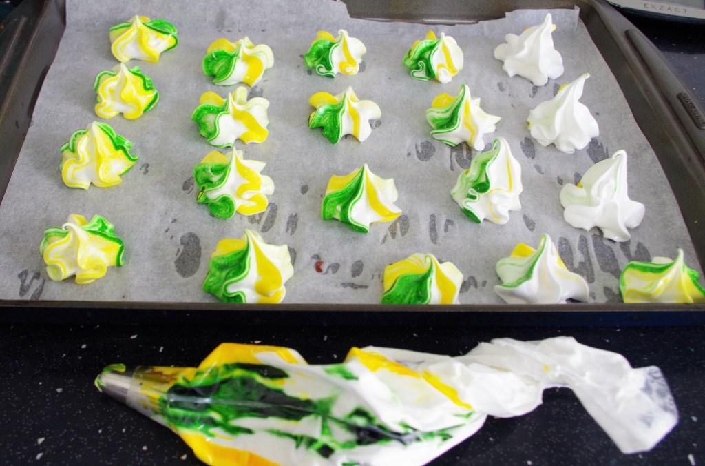 11. You could simply fit a disposable piping bag with a 1cm star nozzle, spoon in your meringue mixture and pipe white kisses onto a lined baking sheet and bake for about an hour. To colour the kisses, squeeze out a little of each food colour onto a saucer and use two artists’ brushes to paint stripes inside the piping bag before spooning in your meringue mixture. (It’s a messy procedure, but not difficult.) Bake for an hour.