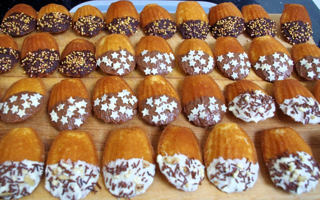 *tip – I found it worked well to have a small bowl filled with sprinkles and to hold each brushed madeleine over it angled downwards, while I used a teaspoon to add the sprinkles. This should minimize the number of coloured sugar balls or similar rolling around on your kitchen floor.