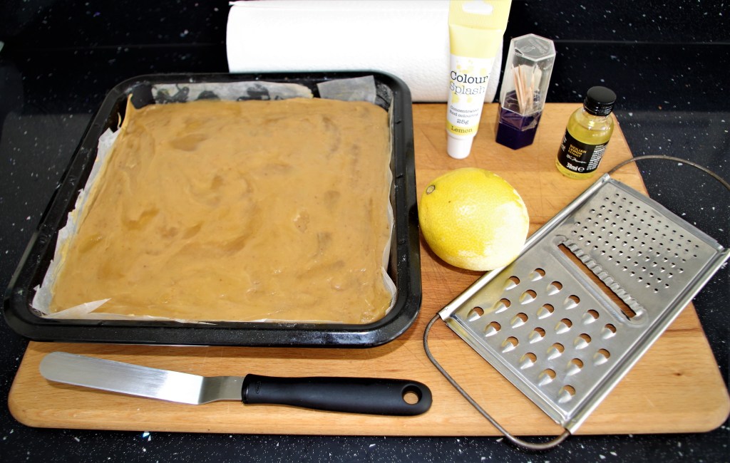 7. Pour about two-thirds of the melted white chocolate over the caramel layer and tilt the tin to spread it evenly, or spread it with a spatula. Working very quickly, add 2 or 3 drops of yellow colouring to the remaining chocolate ganache and mix it in. Now blob this onto the just-poured chocolate. Swirl with a cocktail stick then sprinkle with the lemon zest.
