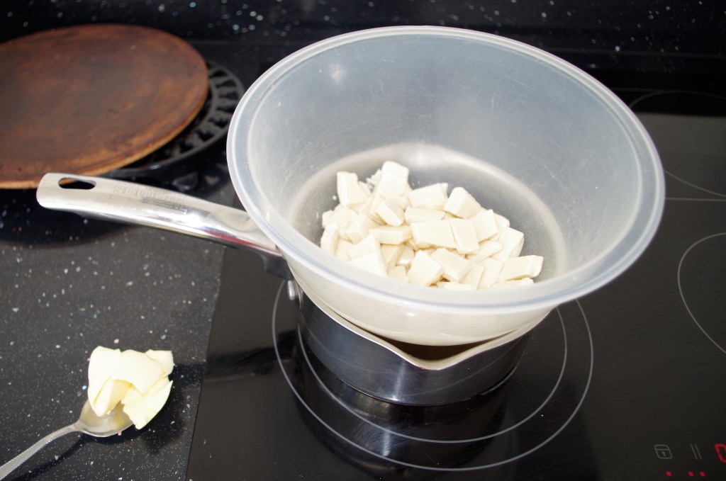 6. Melt the white chocolate, ideally over a bain marie. While it’s melting, put the butter in the microwave for a few seconds and add in the lemon extract (if using), then pour a little of this into the chocolate, stirring it carefully. If there’s no sign of the chocolate seizing, add the rest.
