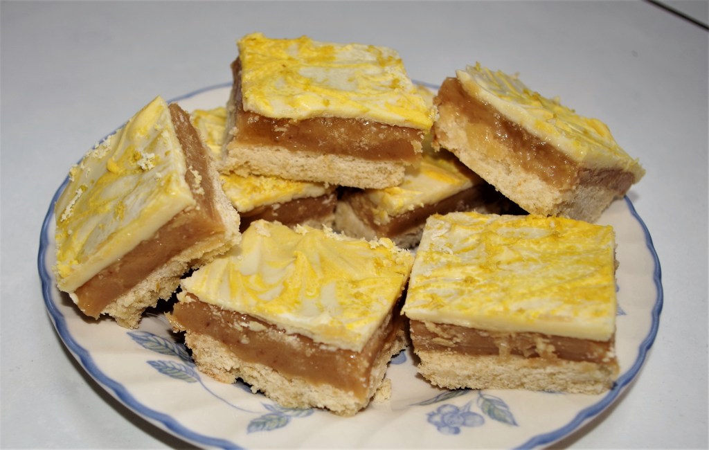 5. Pour the caramel over the shortbread base. Add small blobs of lemon curd and swirl in, using a cocktail stick. Put aside to set firm, maybe in the fridge. (If your lemon curd is firm, give it 20 – 30 seconds in the micro-wave to loosen it.)