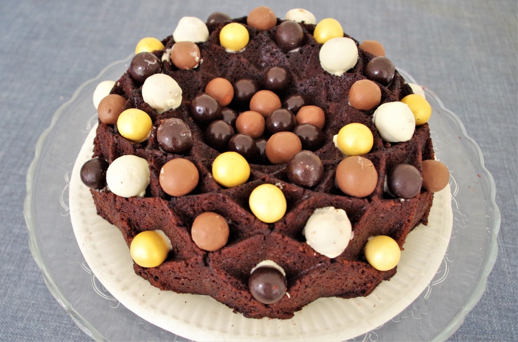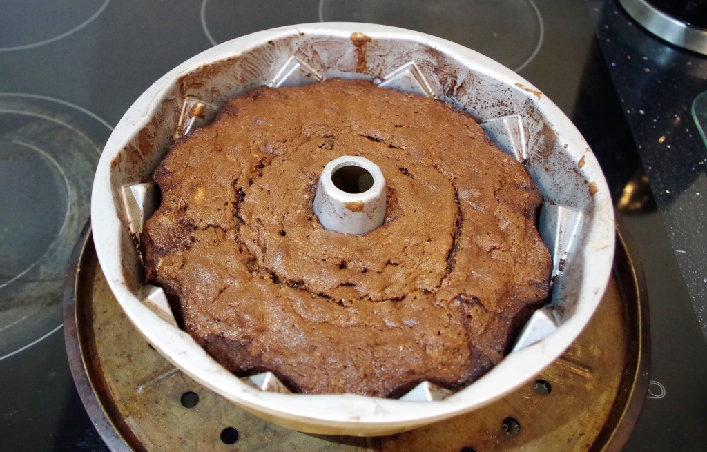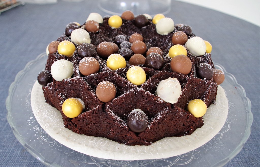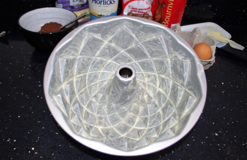 Bundt cakes always look impressive. But, as we’re so often reminded via GBBO, “Style without substance” is no good. Fortunately, this cake has more than mere style. It has a firm moist texture and a lovely depth of flavour – malty & chocolaty.