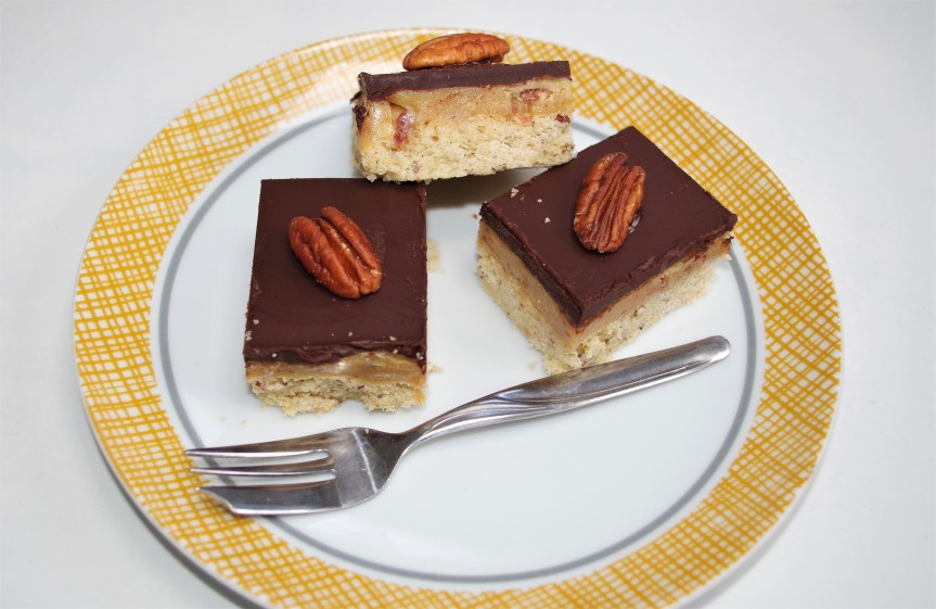 Time: Shortbread base 40 min. Caramel filling 25 min. Chocolate layer 15 min. Cutting & decorating 20 min. Plus lots of cooling/waiting