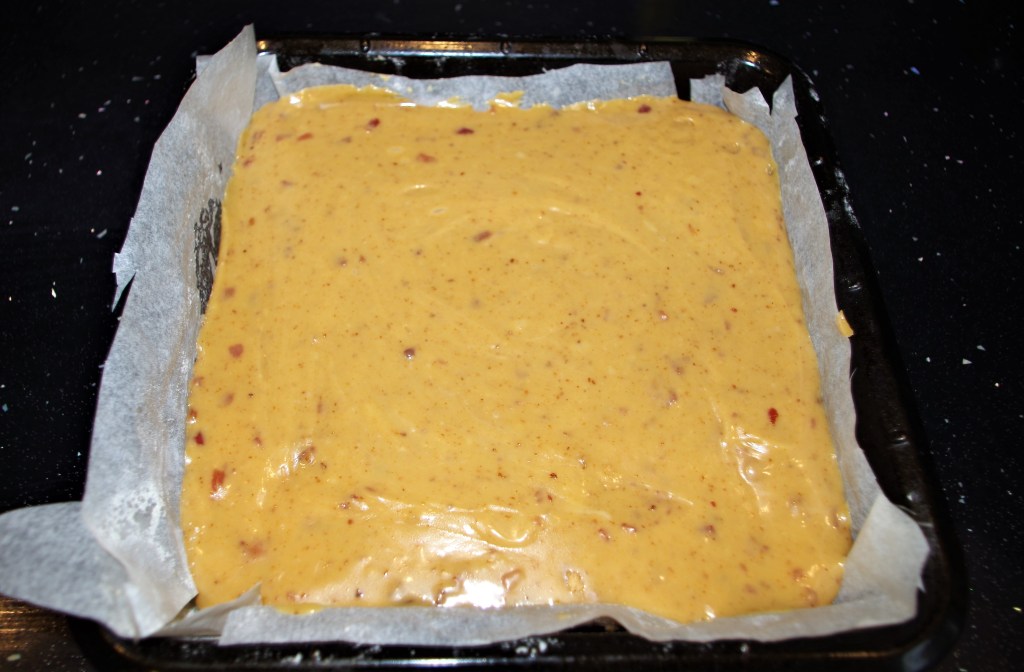 1. Preheat oven to 180C / Fan 160C / 350F / Gas 3. Grease and line the bottom and sides of the tin with baking parchment. (If your tin doesn’t have a loose bottom then leave at least two sides of parchment available to lift out the baked slab.)