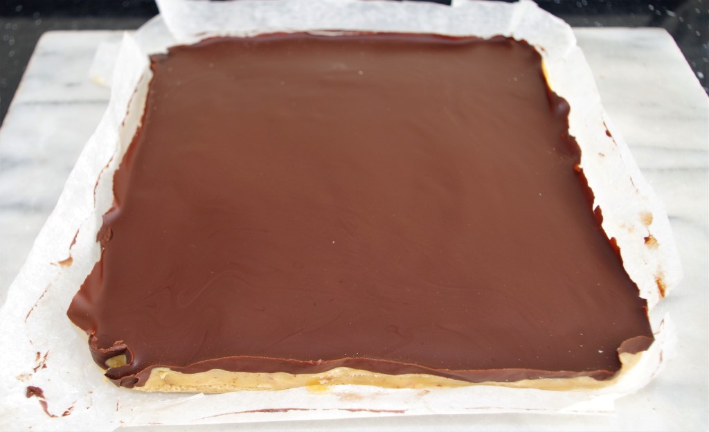 6. Melt the chocolate and butter together over a bain marie, stirring regularly. Pour the mixture over the caramel layer and again tilt the tin to spread it evenly. Before it sets, you could add the pecan pieces or wait until later. (If you want to attach the pecans later, after cutting the slab, then keep a little of the melted chocolate to use. It can easily be re-melted if it has set.)