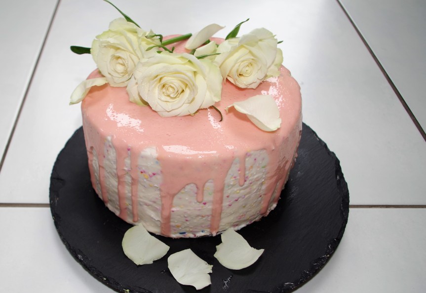 7. You could reserve 100g of the remaining buttercream to pipe rosettes on top later. If so, use the other 300g as follows: Put it in a bowl and stir in the sprinkles. Cover the cake with this and – if necessary – chill in the fridge for a while.