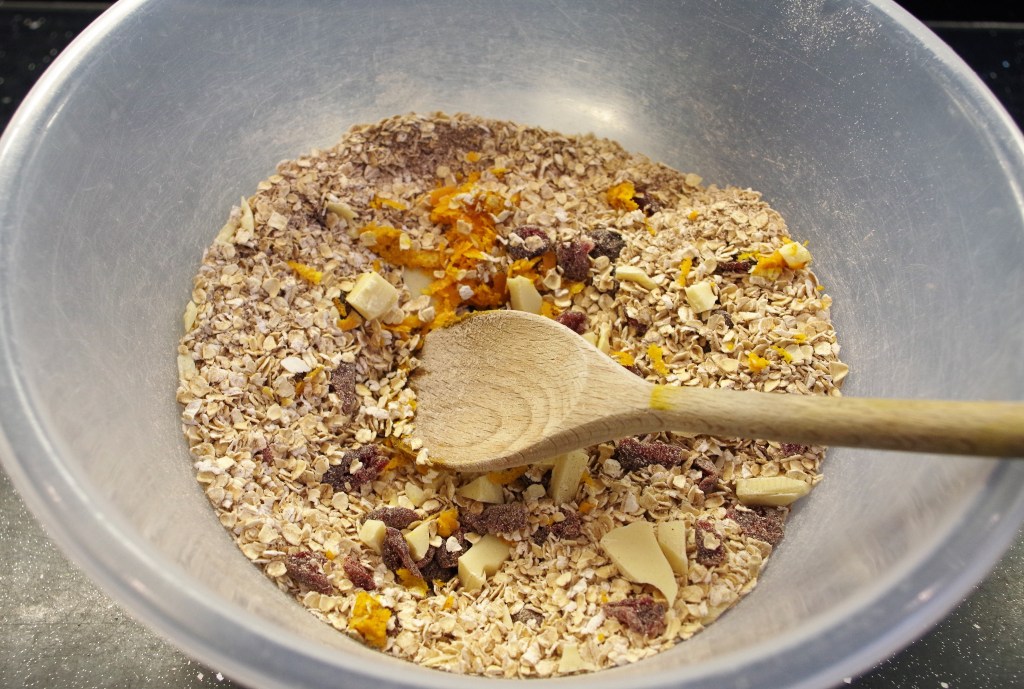 2. Put the oats, spices, cranberries and chocolate pieces in a large bowl and mix well. Grate in the orange zest and mix again. Set the bowl aside.